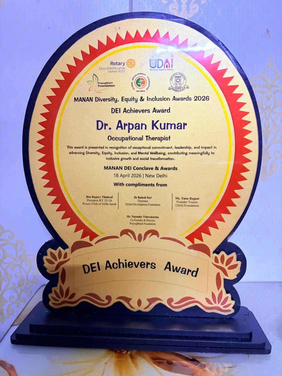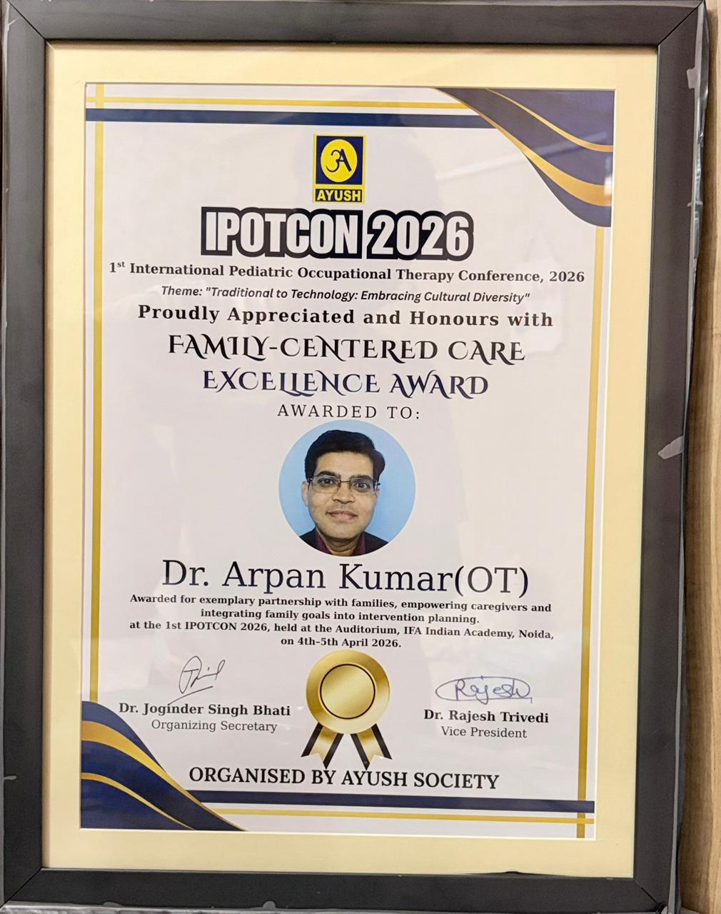 India Most Trusted Health care Award in 2021: OT4KIDS Best Occupational Therapy Centre in Delhi and NCR Rising Professional Excellence Award 2025 Bihar MANAN DEI Achiever Award 2026 by Chief Guest Dr Deepak Vohra, IFS Former Ambassador Govt. of India. 18th April 2026 | New Delhi Family Centred Care Excellence Award in IPOTCON 2026